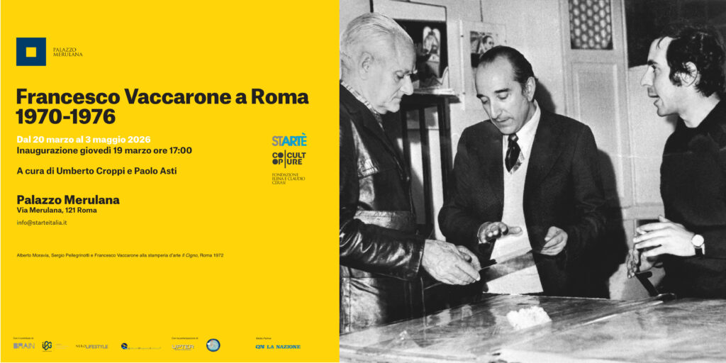 Dal 20 marzo al 3 maggio 2026 Palazzo Merulana, sede della Fondazione Elena e Claudio Cerasi e gestito e valorizzato dalla direzione artistica di Coopculture, ospita la mostra “Francesco Vaccarone a Roma 1970-1976”, un intenso progetto espositivo dedicato a una figura centrale e oggi sorprendentemente ancora poco raccontata della cultura italiana del secondo Novecento.