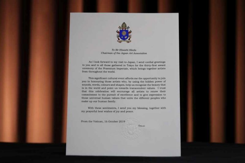 Durante la cerimonia è stata data lettura di una lettera al Presidente della Japan Art Association, Hisashi Hieda, in cui Papa Francesco afferma che la premiazione gli offre la possibilità di unirsi a tutti coloro che sono riuniti a Tokyo per questo importante evento culturale “nell’onorare quegli artisti che, utilizzando il potere nascosto di suoni, parole, colori e forme, ci aiutano a riconoscere la bellezza che c’è nel mondo e ci indirizzano verso i valori trascendenti”. “Confido – aggiunge il Pontefice – che questa celebrazione incoraggerà tutti gli artisti a rinnovare il loro impegno per la ricerca dell’eccellenza e a dare espressione a quei valori umani universali che uniscono i diversi popoli che compongono la nostra famiglia umana”.