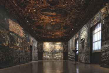 Entrando dalla saletta della Quarantia, nell’ombrosa Sala dello Scrutinio, si rimane colpiti dal non vedere i teleri del Vicentino, del Tintoretto e di Palma il Giovane, andati a sostituire quelli distrutti dall’incendio che colpì Palazzo Ducale nel 1577, ricoperti dalle enormi tele del Venice Circle di Anselm Kiefer. Ma mentre i teleri dei maestri veneti omaggiavano in assoluto la gloria di Venezia, conquistata per terra e per mare, le tele di Kiefer intendono anche illuminare le ombre nascoste in quelle gesta gloriose. Da questo punto di vista, risulta interessante operare un confronto tra le tele sovrapposte, una sorta di cross-mapping, in grado di rivelare, in alcuni casi, una osmosi, una trasmigrazione tra il sotto e il sopra. Ad esempio nel dipinto, che sul lato est della sala, ricopre la Battaglia di Lepanto del Vicentino. L’opera di Kiefer è composta di tre livelli orizzontali. In quello più alto, sventola la bandiera della repubblica di Venezia, con il leone di San Marco, tesa da un vento di gloria che spira dalla vittoriosa battaglia raffigurata nel quadro sottostante. Il pannello intermedio, nel quale è dipinto l’incendio che avvolge palazzo Ducale, è un prima corruzione di tale gloria. Qui le fiamme invadono la facciata del palazzo, salendo al cielo e riverberando sull’acqua del bacino. Il pannello in basso rappresenta il regno dell’oltretomba, nel quale rimangono sospesi, come in un macabro teatrino di marionette, abiti di grandi e piccoli, uno di seguito all’altro. Abiti inframmezzati da falci, che nell’incendio e nella battaglia che ancora infuria sotto il dipinto, hanno mietuto le vite di coloro che li indossavano.