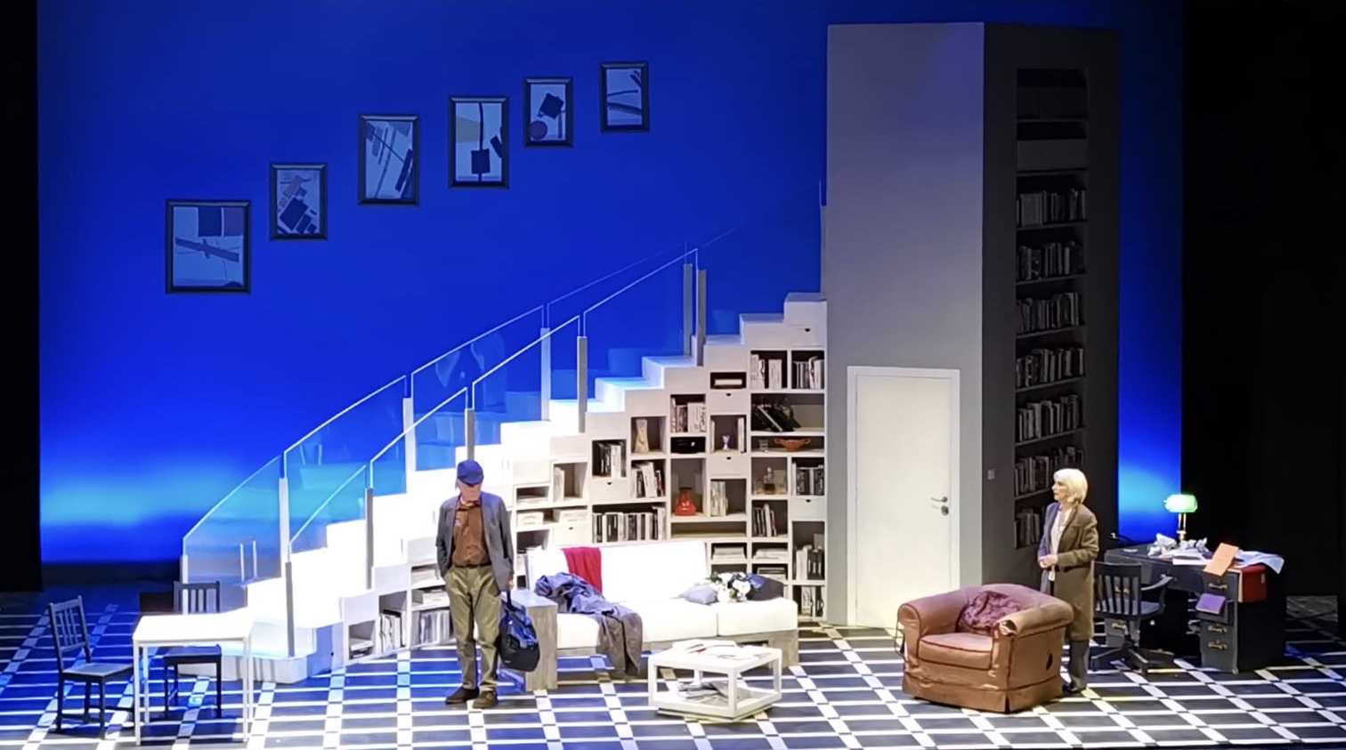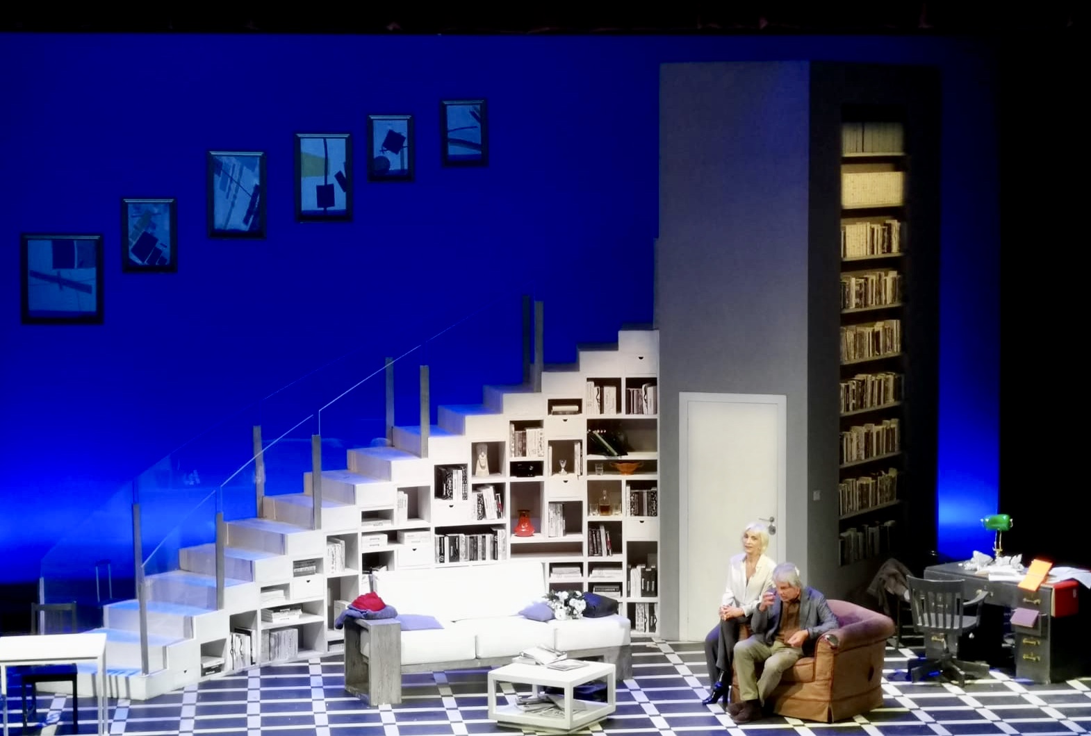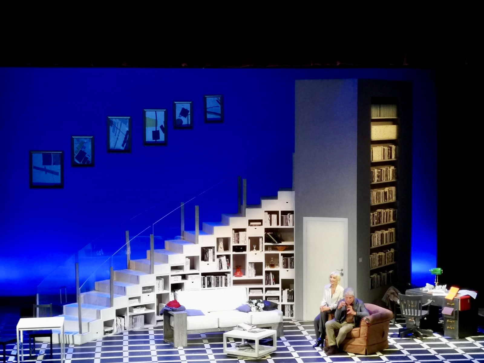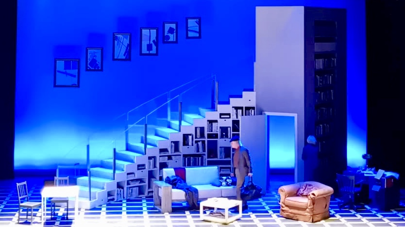 Ed è proprio un invito ad accorrere quello rivolto al suo pubblico da Michele Placido al termine della prima dello spettacolo. «Un ringraziamento agli abbonati che con l’iniziativa “adotta una poltrona” hanno contribuito al rinnovamento del teatro, che sopravvive solo grazie ai propri profitti: continuate a partecipare numerosi, sarà una stagione straordinaria». Ed è in effetti un buon inizio con “Piccoli crimini coniugali” adattato e messo in scena da Michele Placido che ne è anche il protagonista, che sta riscuotendo il consenso del pubblico. Ambientato in una casa borghese, dominata dal rassicurante bianco e blu, dove vivono insieme da più di 15 anni Gilles, uno scrittore di polizieschi, cinico e “tombeur de femmes” e sua moglie Lisa, logorata dalla gelosia e insicurezza, interpretata da una superlativa Anna Bonaiuto. Una routine consolidata e apparentemente felice, dominata dal narcisismo del marito – un convincente Michele Placido – preso dal lavoro e  dalle proprie manie e la compagna, segretamente dedita all’alcol, utilizzato come rimedio per sedare le ansie e il timore di esser tradita e abbandonata.