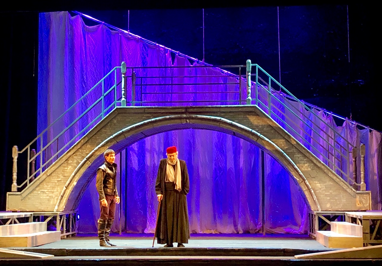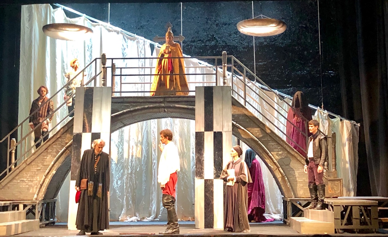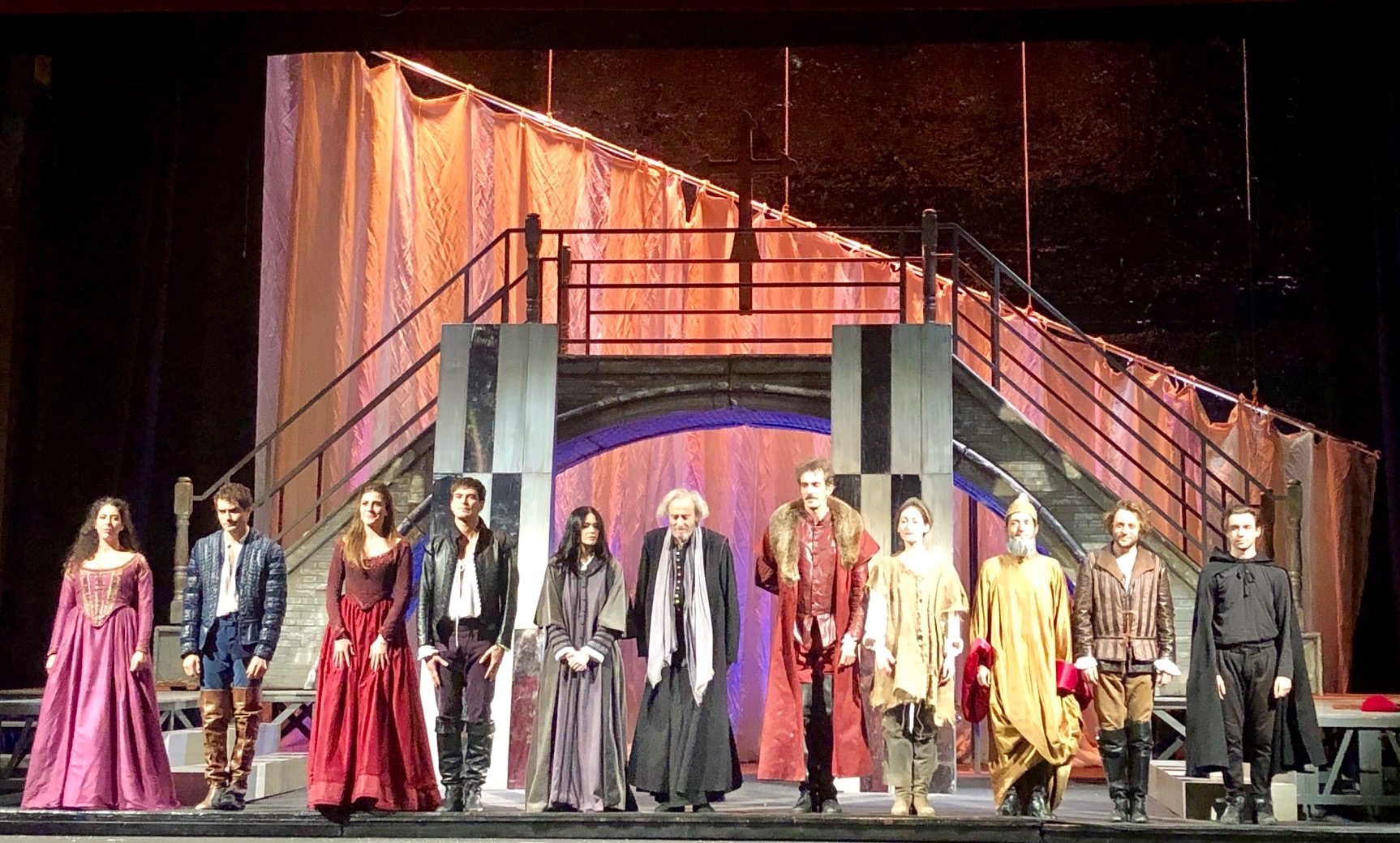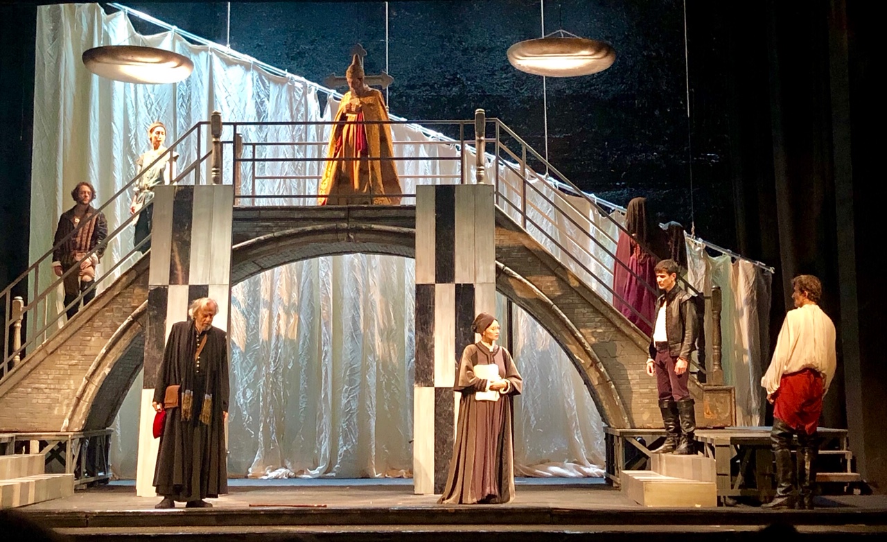 Una gravità nei movimenti e nelle espressioni che trasuda dolore: il dispiacere di essere additato e criticato perché “ebreo” ma soprattutto per praticare l’usura, peccato grave per i cristiani. Nei panni del suo nemico giurato, un mercante navale Antonio – il bravo Ruben Rigillo suo figlio – prodigo e benefattore in città, che per aiutare un amico dovrà farsi garante di un prestito proprio con Shylock, impegnando “una libbra di sua carne” in cambio dei tremila ducati da restituire in tre mesI. Un crogiuolo di sentimenti: invidia, avarizia, gelosia, amicizia e amore; una lotta tra il bene e il male, tra l’avidità incarnata da Shylock e la generosità rappresentata da Antonio. In campo anche il conflitto religioso che oggi come ieri animava il dibattito sociale. Un’epoca in cui mal si tollerava l’usura, che dilagava come una piaga nelle città, utilizzando le commedie quale specchio della volontà dei potenti patrocinatori per attirare lo sguardo dell’opinione pubblica sul “nemico ebreo”, distogliendolo così dal vero “mal governo” che affamava i poveri.
