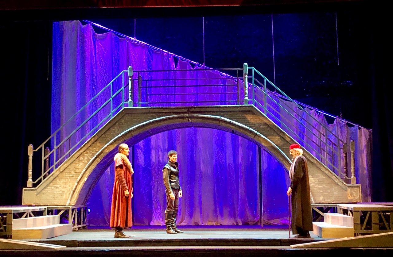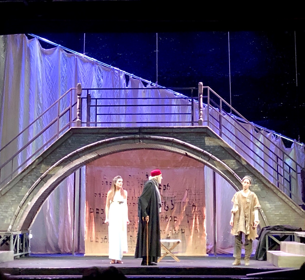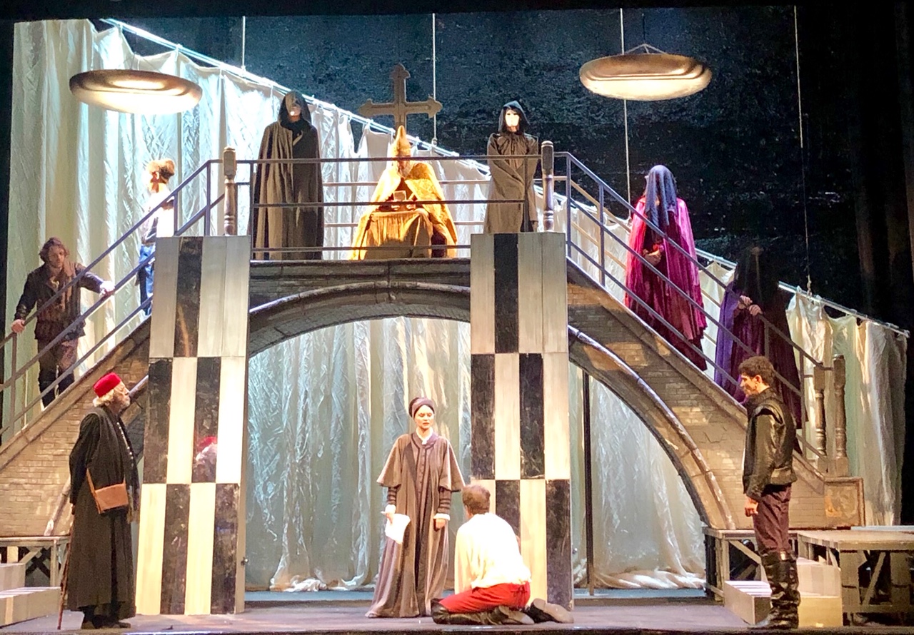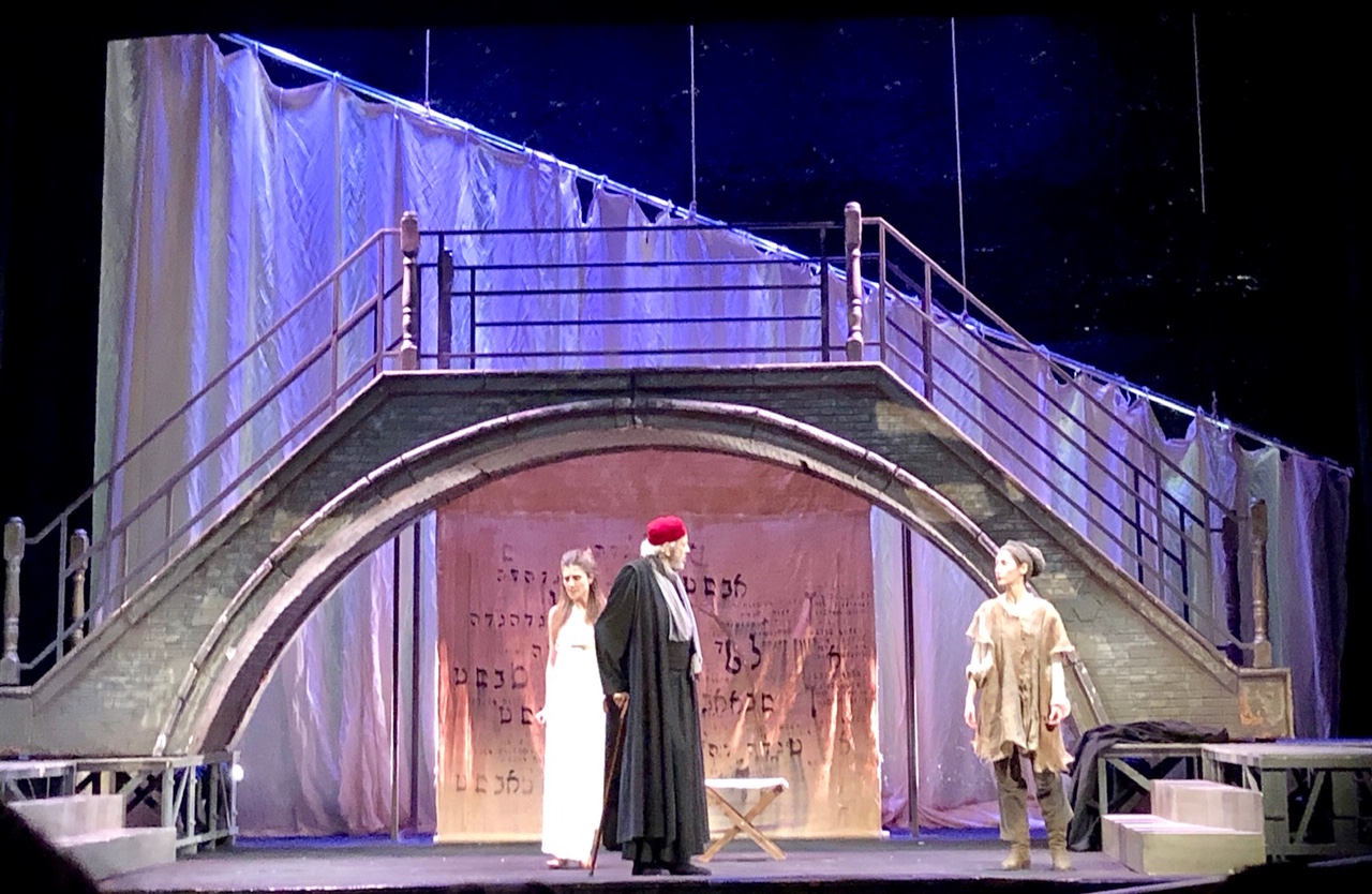 Una gravità nei movimenti e nelle espressioni che trasuda dolore: il dispiacere di essere additato e criticato perché “ebreo” ma soprattutto per praticare l’usura, peccato grave per i cristiani. Nei panni del suo nemico giurato, un mercante navale Antonio – il bravo Ruben Rigillo suo figlio – prodigo e benefattore in città, che per aiutare un amico dovrà farsi garante di un prestito proprio con Shylock, impegnando “una libbra di sua carne” in cambio dei tremila ducati da restituire in tre mesI. Un crogiuolo di sentimenti: invidia, avarizia, gelosia, amicizia e amore; una lotta tra il bene e il male, tra l’avidità incarnata da Shylock e la generosità rappresentata da Antonio. In campo anche il conflitto religioso che oggi come ieri animava il dibattito sociale. Un’epoca in cui mal si tollerava l’usura, che dilagava come una piaga nelle città, utilizzando le commedie quale specchio della volontà dei potenti patrocinatori per attirare lo sguardo dell’opinione pubblica sul “nemico ebreo”, distogliendolo così dal vero “mal governo” che affamava i poveri.