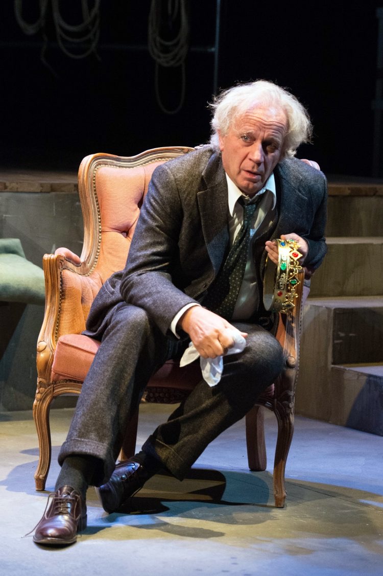 Ed è Geppy Gleijeses, il direttore del teatro Quirino e pluripremiato interprete a rivestire i panni di “Sir” – con una performance sensazionale – che alterna la disperazione di un attore in declino, alla maestosità del ruolo di “Re Lear”. Ed è soltanto per merito di Norman, che, tra lacrime, recriminazioni e cali fisici, il vecchio “Sir” riesce a calcare la scena, ancora una volta. Un rapporto “servo-padrone” interdipendente, che riecheggia la commedia classica plautina, nella quale era il domestico a sbloccare la situazione in cambio dell’affrancamento; e invece qui, si prodiga, per vedere riconosciuti i suoi meriti, mai davvero apprezzati. E non a caso, nelle sue memorie, “Sir” ringrazia tutte le maestranze, eccetto il suo fidato “servo di scena”, che se ne fa in cruccio fino alla fine.