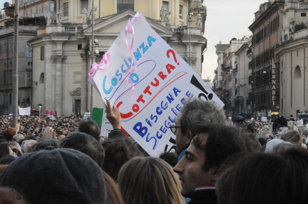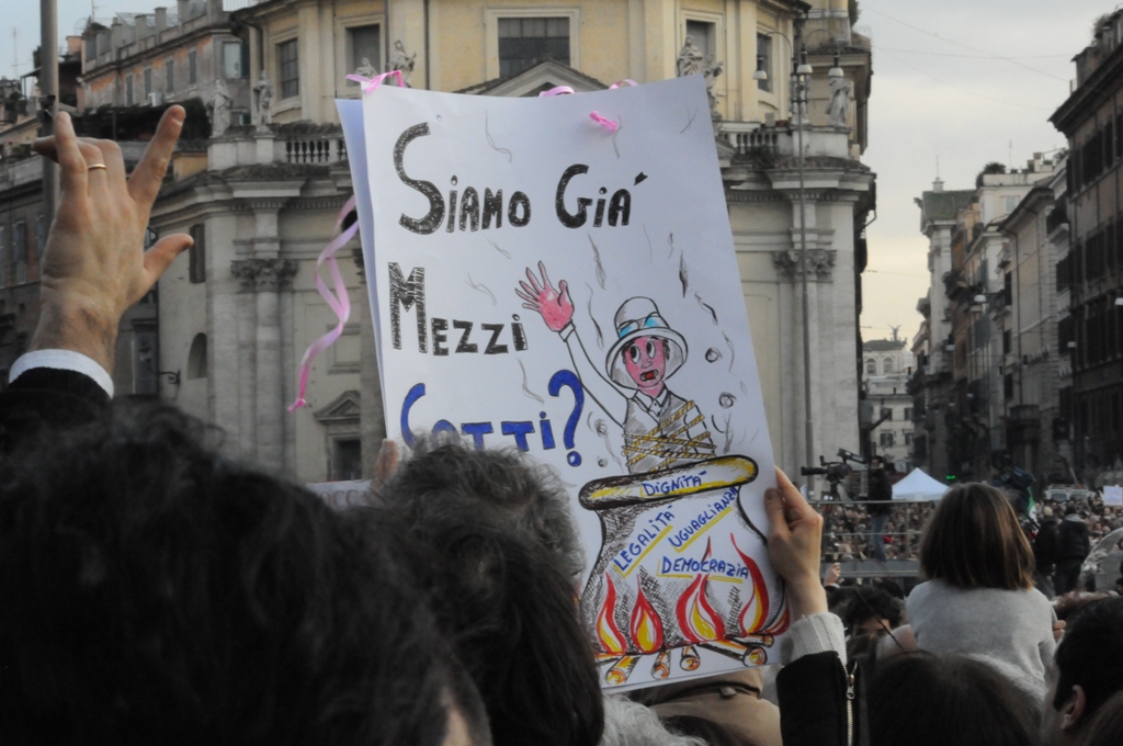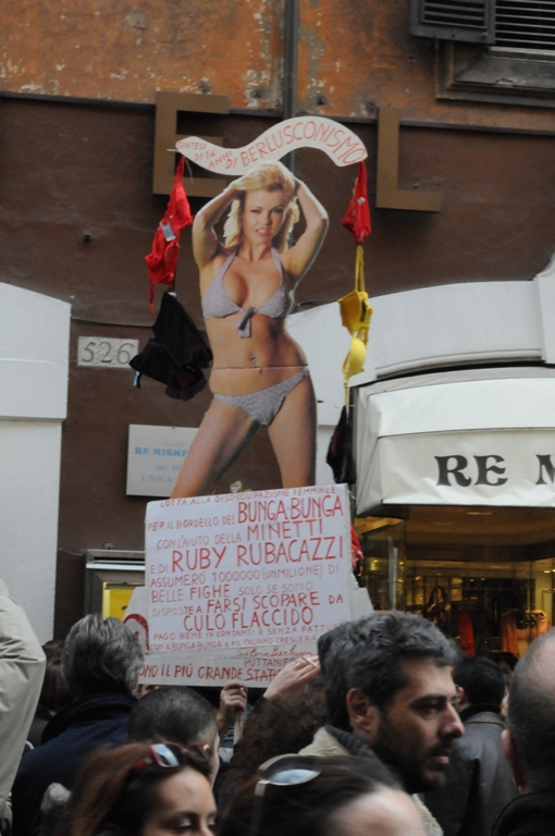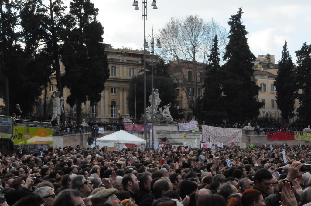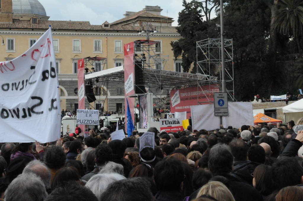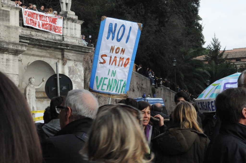 ROMA – Una piazza gremita con gli accessi oramai chiusi a tutti poco dopo le 14. Una marea di donne con cartelli scherzosi e scritte irriverenti sui “bunga bunga” del premier, che hanno fatto di noi un Paese-barzelletta in tutto il mondo. Donne che si ribellano al fatto che un Presidente del Consiglio possa fornire un’immagine così squallida della donna e del suo corpo.