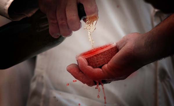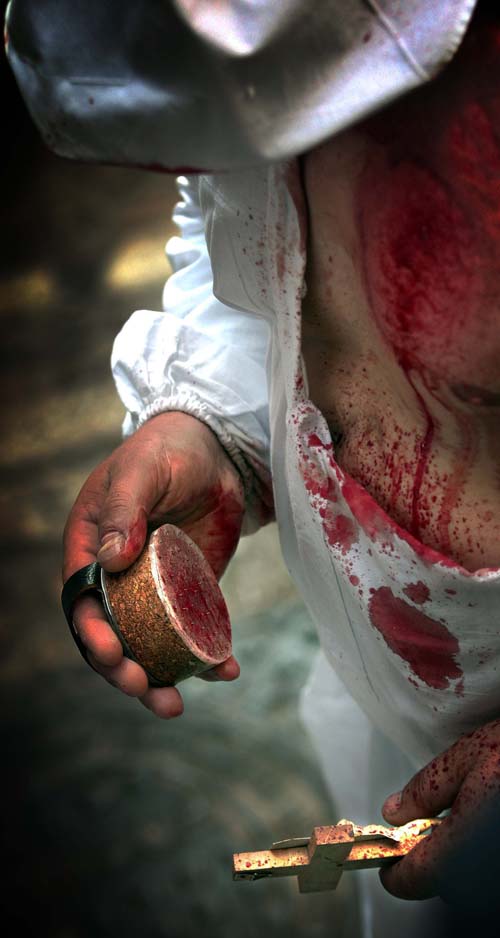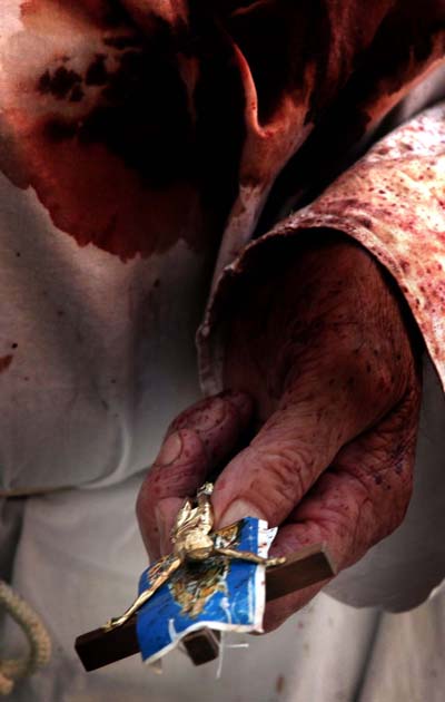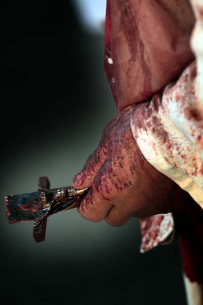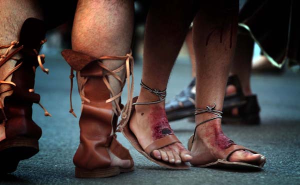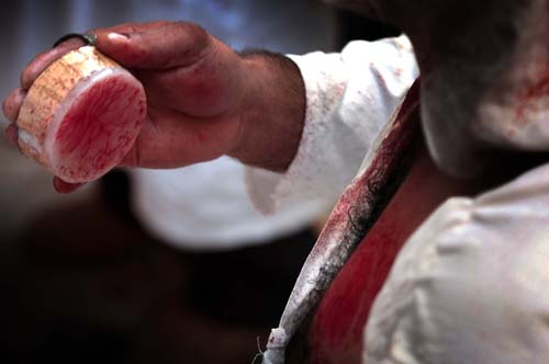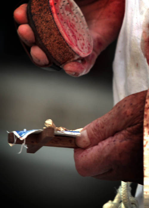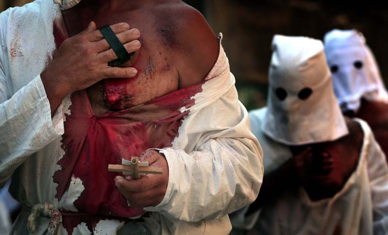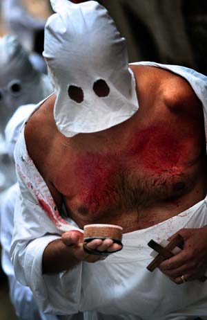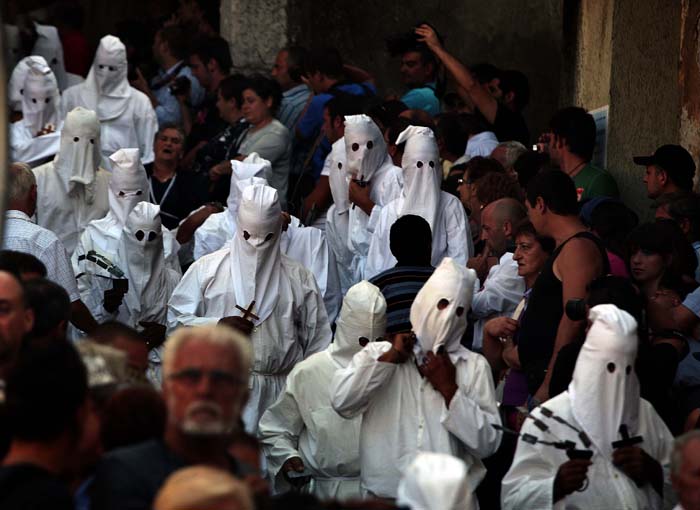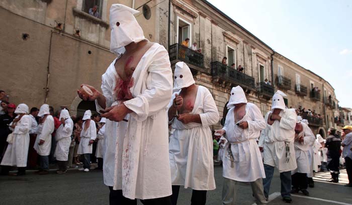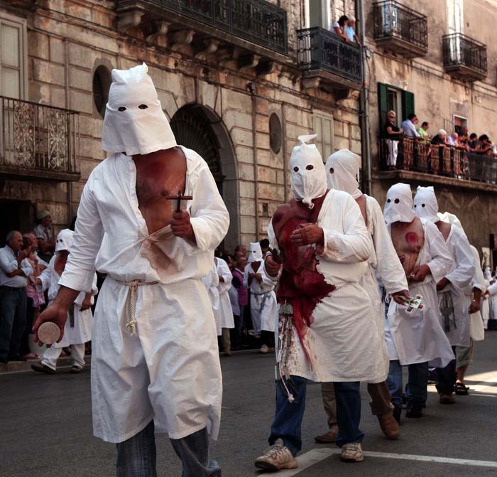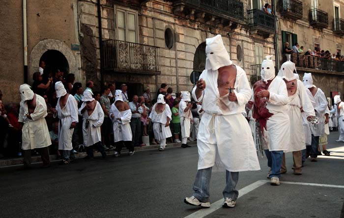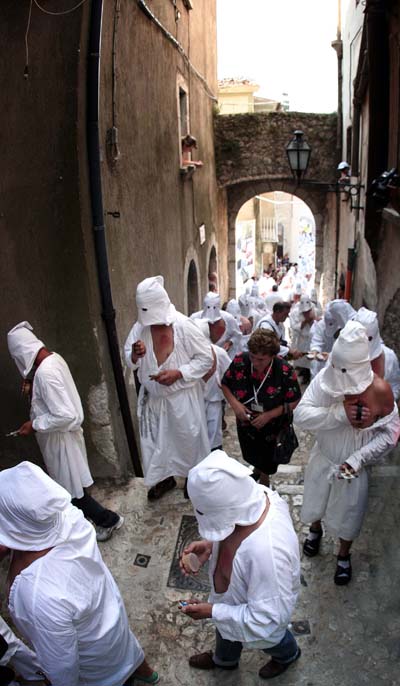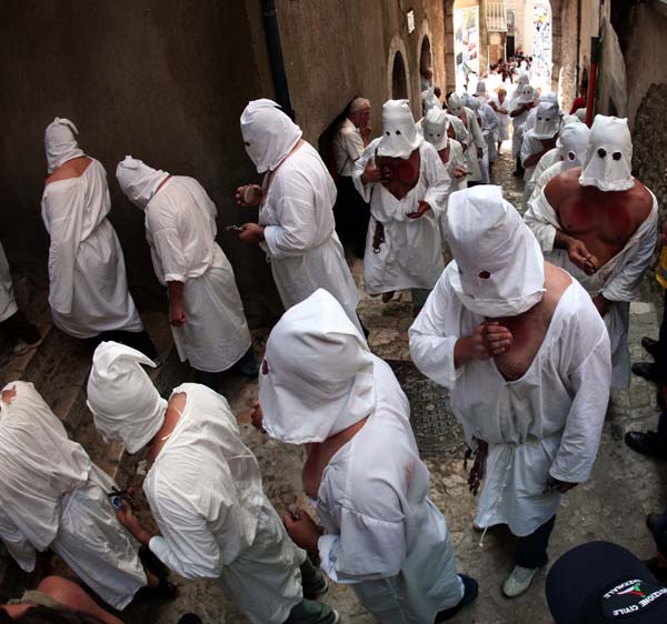 Alla processione prendono parte un numeroso gruppo di penitenti che, in saio bianco e cappuccio, rinnova un antico rito medioevale di flagellazione. I penitenti, con in una mano una croce di legno e nell’altra un cilicio di sughero irto di aculei, oppure con una spugna piena di aghi bagnata di vino, si percuotono il petto fino a sanguinare. Il rito parte dalla Basilica dell’Assunta, procedendo inizialmente all’indietro per non volgere le spalle alla Madonna. La processione, capeggiata da una statua di San Girolamo Penitente si snoda per tutto il paese come se volesse proteggerlo.