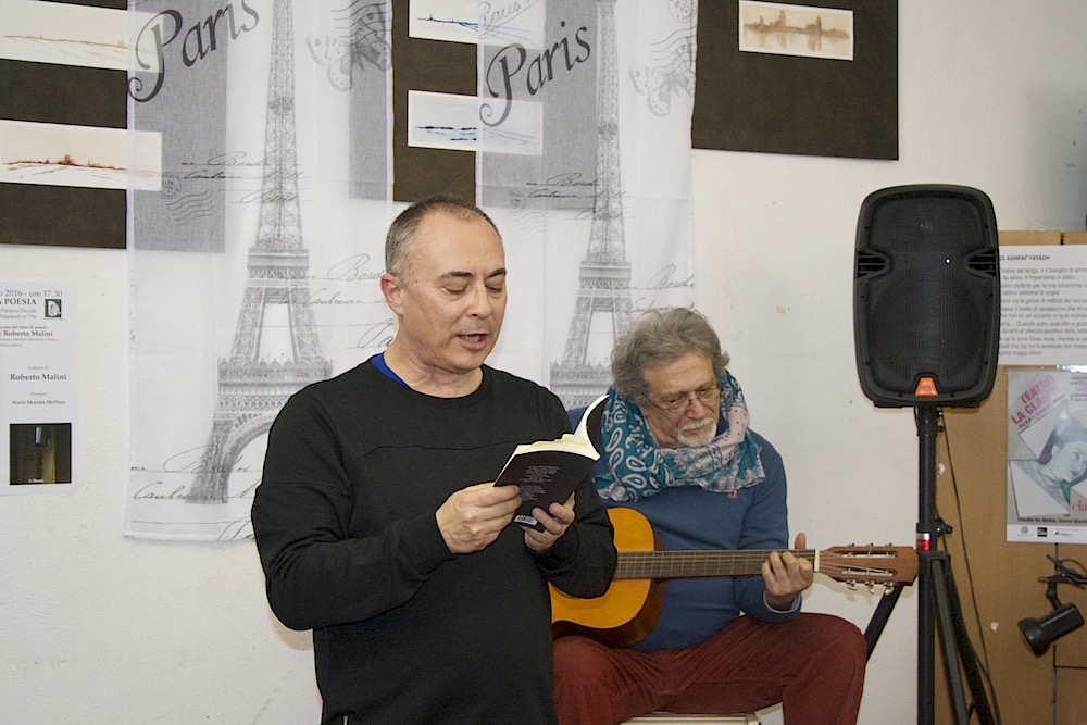 Dopo il saluto da parte di Barbara Garassino, coordinatrice delle attività culturali della Stanza, che ha offerto agli intervenuti utili note biografiche sull’autore, Mario Morales Molfino ha presentato l’evento, evidenziando come all’opera del poeta corrisponda sempre un impegno quotidiano a fianco dei perseguitati, contro intolleranza, violenza e persecuzione. Un commento musicale e sonoro legato alla città di Parigi e al Bataclan – locale in cui il 13 novembre 2015 ebbe luogo l’attentato terroristico, con 93 vittime – ha sottolineato la prima parte della lettura, caratterizzata da una decina di poesie dedicate alla tragedia consumatasi nella sala di spettcolo parigina: note dall’ouverture dell’operetta di Jacques Offenbach dal cui titolo il locale parigino prese il nome nel 1864; raffiche di kalashnikov e la musica concreta di Pierre Schaeffer. Il poeta ha letto senza microfono, dosando ritmi, volumi, intensità e asprezze della voce, scandendo sillabe onometopeiche che riconducevano il pubblico alle grida, alla paura, ai passi di corsa, alle raffiche del 13 novembre. Nell’intervallo il poeta italoperuviano Steed Gamero leggeva due poesie tratte dal suo libro “I ragazzi della casa del Sole”, pluripremiato e giunto alla seconda edizione. Seconda edizione e importanti riconoscimenti anche per “Cenere sulle ciglia” di Daniela Malini, che interpretava due liriche. Nelle vesti di chitarrista, Mario Morales Molfino accompagnava la seconda parte del reading, in cui Malini leggeva alcune delle sue poesie dedicate ai diritti umani e alla necessità di combattere fame, povertà e intolleranza. Profetica la prosa poetica “La bomba”, che l’autore ha letto proprio nel giorno in cui il dittatore della Corea del nord Kim Jong annunciava al mondo di possedere versioni miniaturizzate di bombe atomiche, armi di distruzione di massa che possono ormai essere contenute in un valligione. Pieno di speranza l’inno per la Sierra Leone, composto dal poeta in occasione del conferimento del titolo di Poeta Laureato con cui le istituzioni della nazione africana l’hanno onorato, riconoscendo il ruolo delle sue opere letterarie a difesa della pace, dell’uguaglianza e del rispetto dei diritti umani. Il reading è terminato con un altro inno: “Siamo l’arcobaleno”, che Malini ha intonato in inglese e poi recitato in italiano. “Siamo l’arcobaleno” (We are the Rainbow”) è stato scelto dalla comunità gay in Uganda come proprio inno di uguaglianza e libertà, in un paese in cui vigono ancora leggi omofobe e la comunità LGBT è perseguitata.