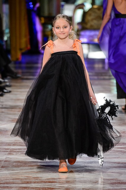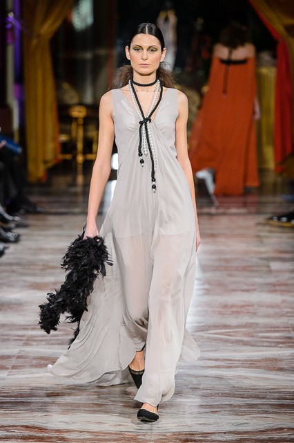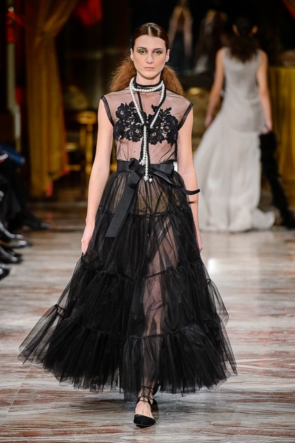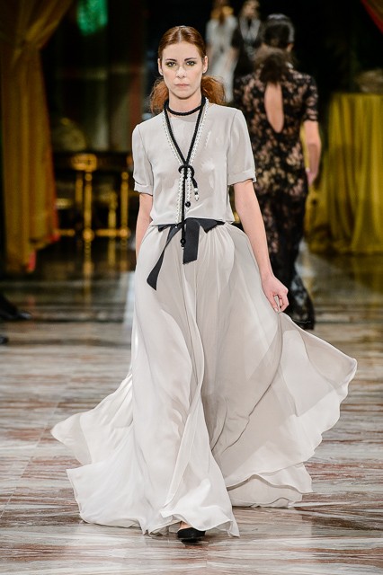 L’intrigante e sensuale nero crea un effetto di ricercata naturalezza quando si fonde con il bianco etereo. Nodi di grogrè, cordoni di seta circondano il collo, ponchos velati si alternano sul verde smeraldo e pelle d’angelo.. Chiude la sgfilata una sposa boldiniana dall’allure poetica.