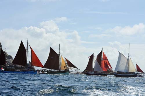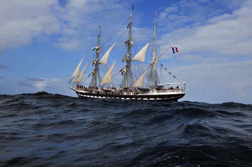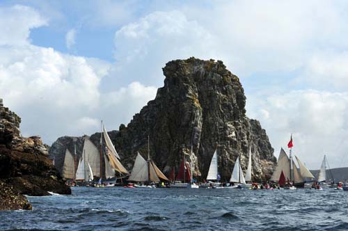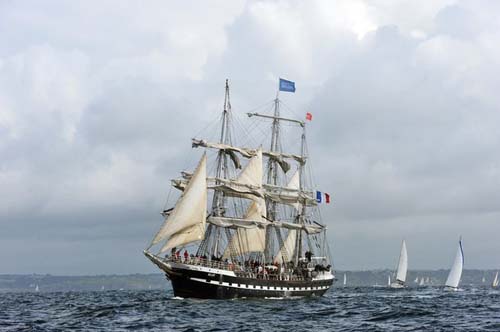 Ci troviamo al largo della costa occidentale francese, di fronte alla città portuale di Brest, nella regione della Bretagna. Lo spettacolo a cui si assiste è come quello di un film, con il mare mosso da un forte vento che agita le onde che si infrangono violentemente sulla costa rocciosa. Un giusto contorno a questa autentica parata di vele d’epoca.