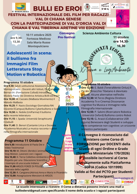 Il convegno interdisciplinare “Adolescenti in scena: il bullismo fra immagini, letteratura, film, stop motion e robotica” — organizzato a Montepulciano il 10 e 11 ottobre — vede la partecipazione di Fondazione Collodi, Regione Toscana, Comune di Montepulciano, Val di Chiana 2025, SNCCI, GSA Giornalisti Specializzati, con la Media Partnership di CinecittàNews e il Gemellaggio con TSN Tulipani di Seta Nera.