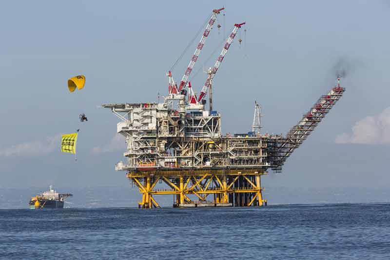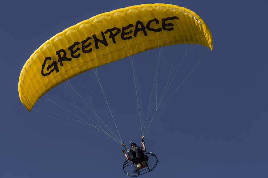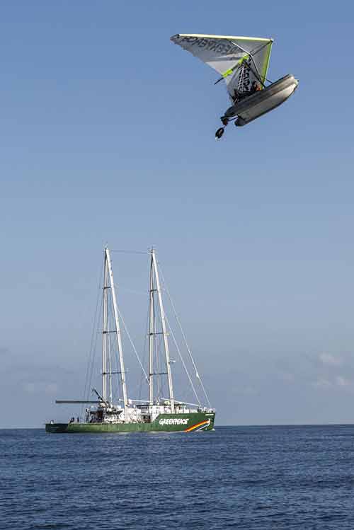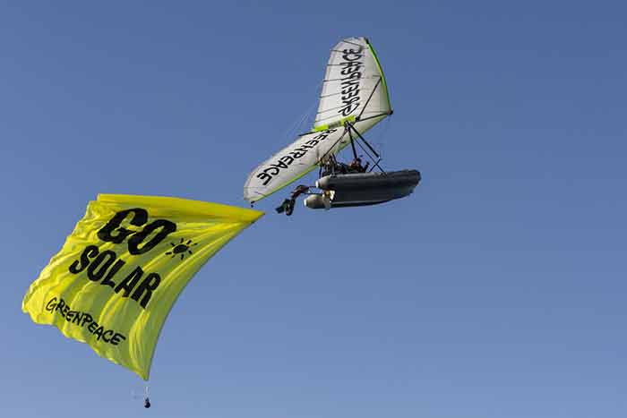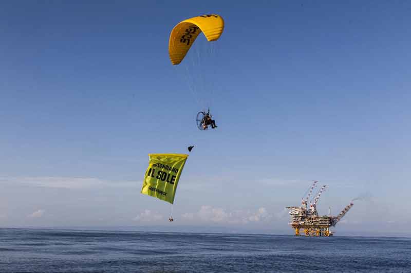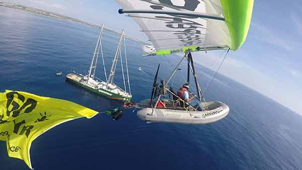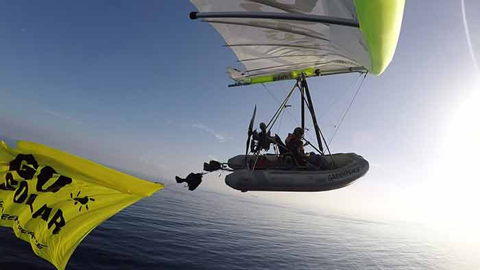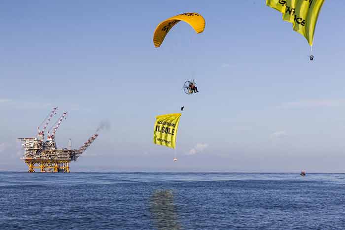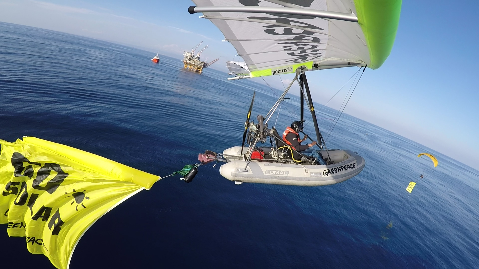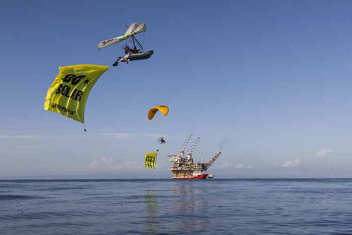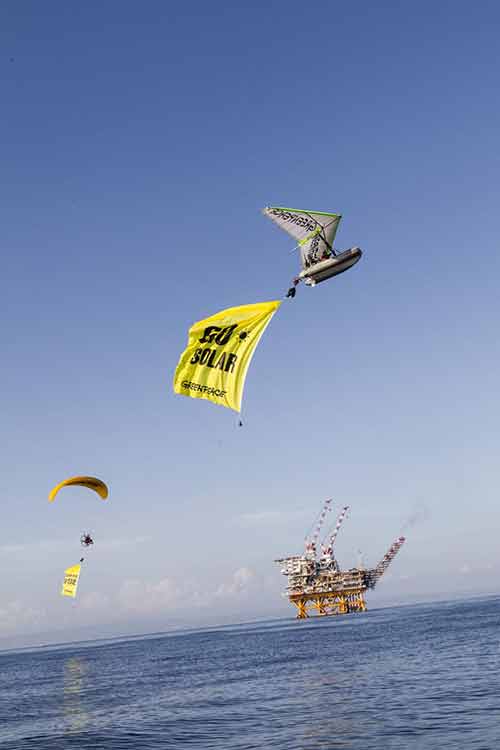 CANALE DI SICILIA – Attivisti di Greenpeace partiti dalla Rainbow Warrior, nave simbolo dell’associazione ambientalista, sono entrati in azione questo pomeriggio presso la piattaforma Vega A, davanti alle coste siciliane, a circa 12 miglia da Pozzallo. Un attivista a bordo di un gommone volante munito di deltaplano ha aperto uno striscione con la scritta “Go solar”, per spronare il governo a cambiare rotta e investire in rinnovabili. In contemporanea un altro attivista su un paramotore ha aperto un secondo striscione con il messaggio “Accendiamo il sole”.