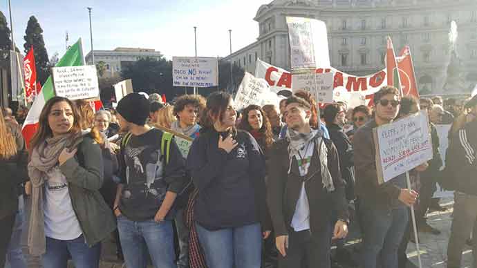 “Siamo il popolo che dice NO” – dichiara Stefano, 24 anni – “Diciamo NO alla riforma costituzionale, NO al Governo del Jobs Act, della Scuola e dello Sblocca Italia. La riforma costituzionale serve a garantire chi sta nei Palazzi del potere. La riforma Renzi-Boschi è una minaccia per noi giovani e le nostre famiglie, perché ha l’obiettivo di garantire maggiori poteri a chi ci ha fatto pagare la crisi finanziaria. Una crisi causata dalle stesse banche che sostengono questa riforma, come JP Morgan. LE notizie di fermi e sequestri che stanno circolando sono totalmente infondate, non risponderemo alle provocazioni perché la nostra è una manifestazione serena”