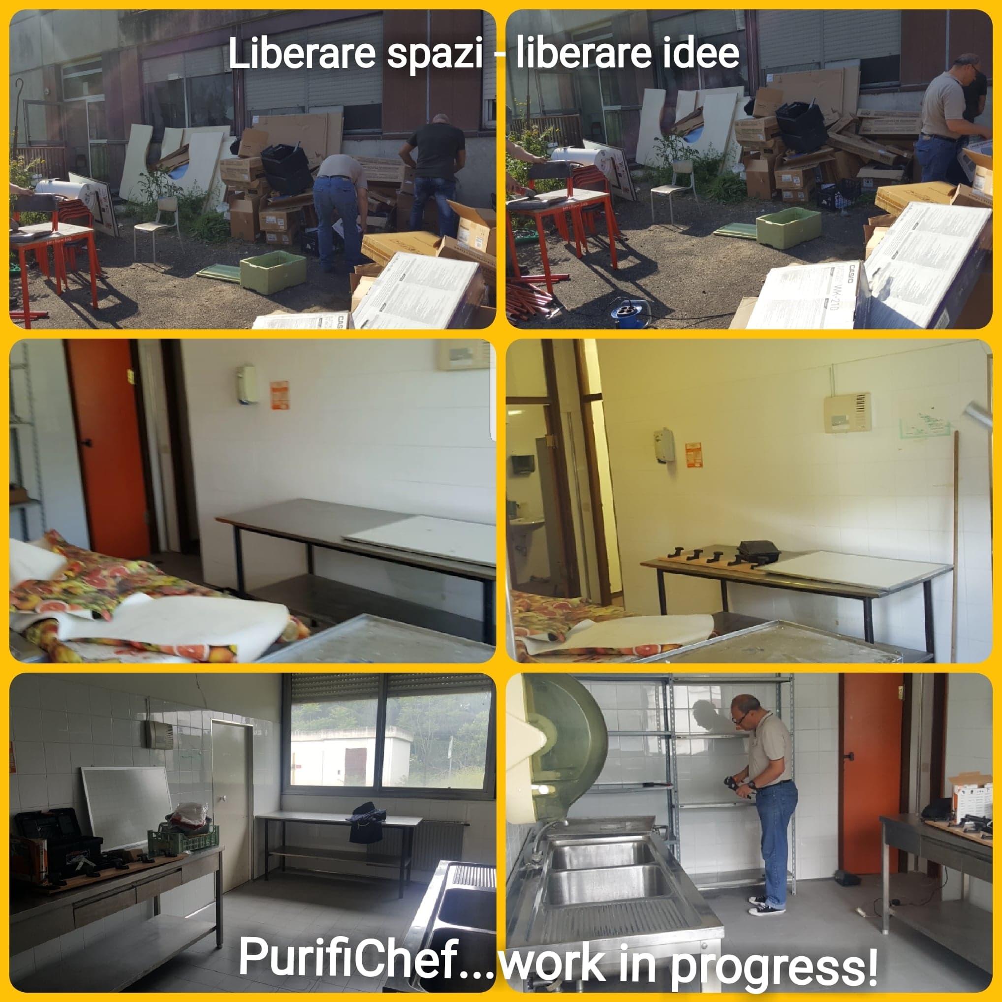Le idee fiorivano insieme ai tigli e ai papaveri nei campi quando, dal fondo dimenticato di un corridoio, in una stanza divenuta magazzino scoprimmo ciò che restava di un vecchio cucinotto. Dovevamo al più presto portarlo alla luce e restituirlo alla scuola, disseppellirlo da tutte le cianfrusaglie accumulate nel tempo. Seguirono settimane febbrili di consultazioni, idee, progetti fino al giorno in cui, coinvolgendo il papà di una bambina, riuscimmo a svuotare anche il vecchio stanzino. Emersero tra la polvere secolare un grande lavandino, due tavoli da cucina, una doppia dispensa e, dopo aver ripulito il tutto, riuscimmo a ricomporre una vera e propria cucina!