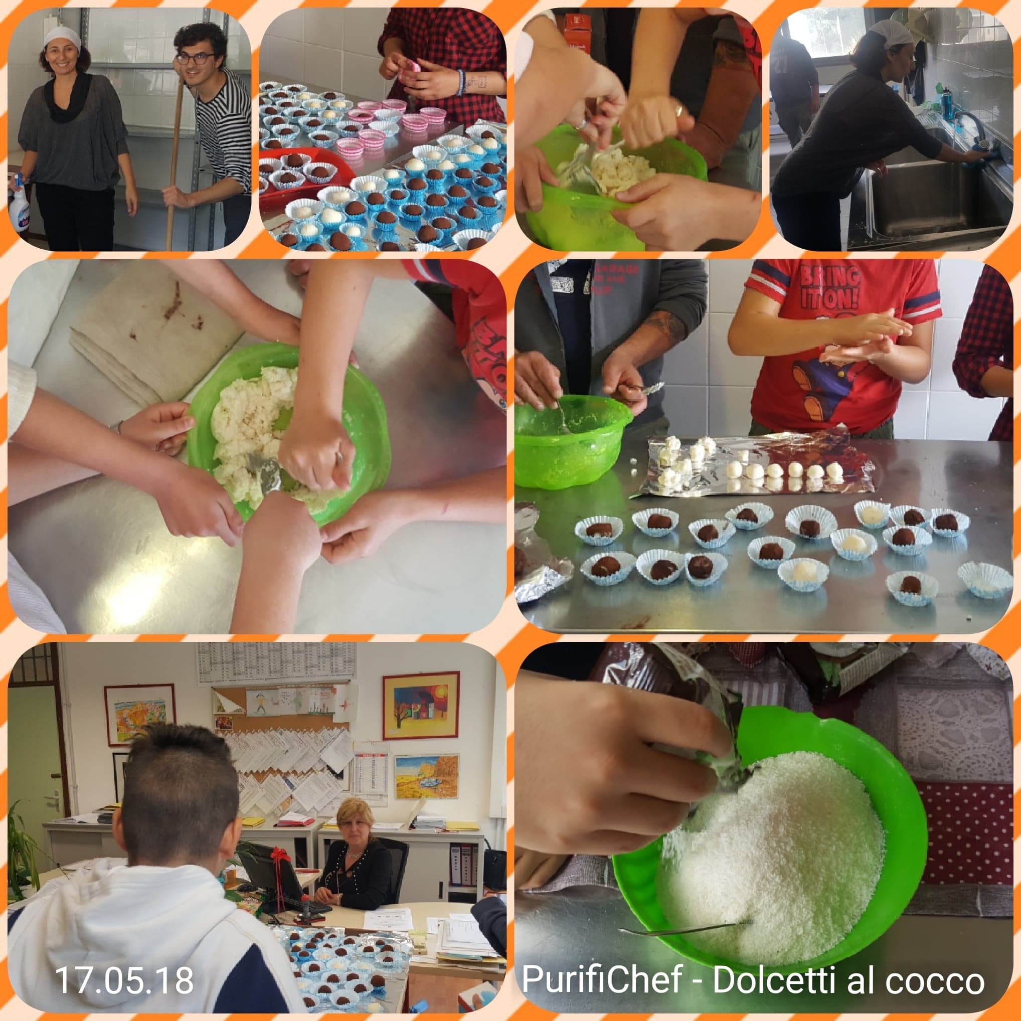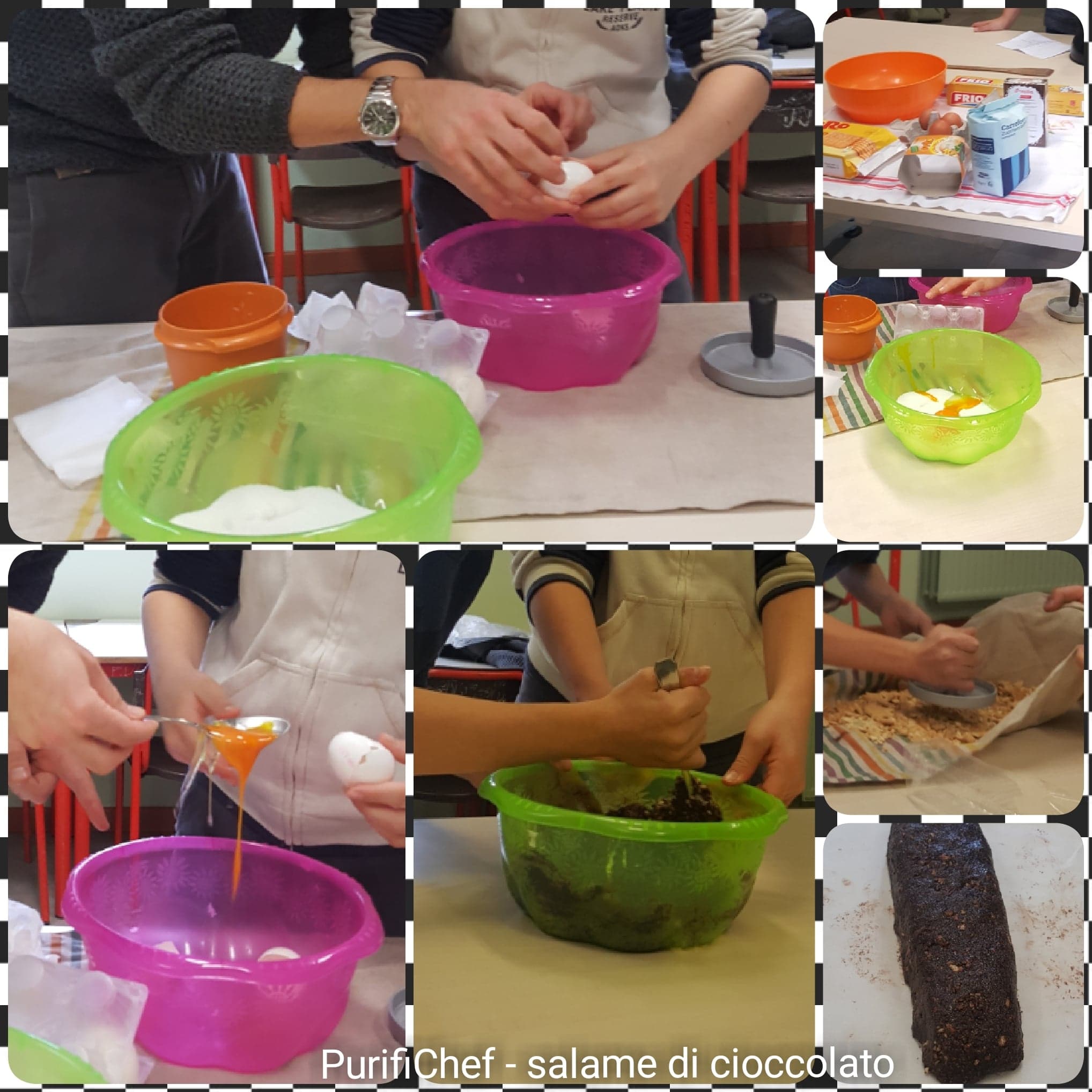 Alex quel giorno impastò con un impegno e una dedizione mai visti prima insieme al compagno da lui scelto, si divertì moltissimo anche Fabio che si impiastricciò le mani col suo amico, soddisfatto più di Anna Moroni quando fa le tagliatelle. Poi venne la volta degli gnocchi morbidi e del salame di cioccolato buono da leccarsi le dita. La primavera portò con sé i colori della macedonia e il profumo dei dolcetti di cocco “tutti fatti a mano e con prodotti non conservati” come annunciava Fabio a tutte le prof che incontrava, mentre spingeva orgoglioso il carrello nell’atrio di scuola. Infine, il maggio piovoso giunse con il nome del laboratorio, che chiamammo “PurifiChef” in un’ardita crasi tra il nome della scuola e l’ambito culinario, senza tralasciare l’arrivo dei grembiuli con tanto di logo accattivante ideato dai ragazzi.