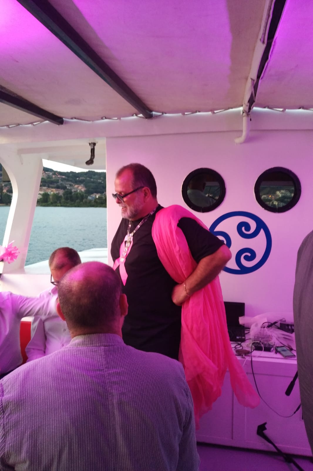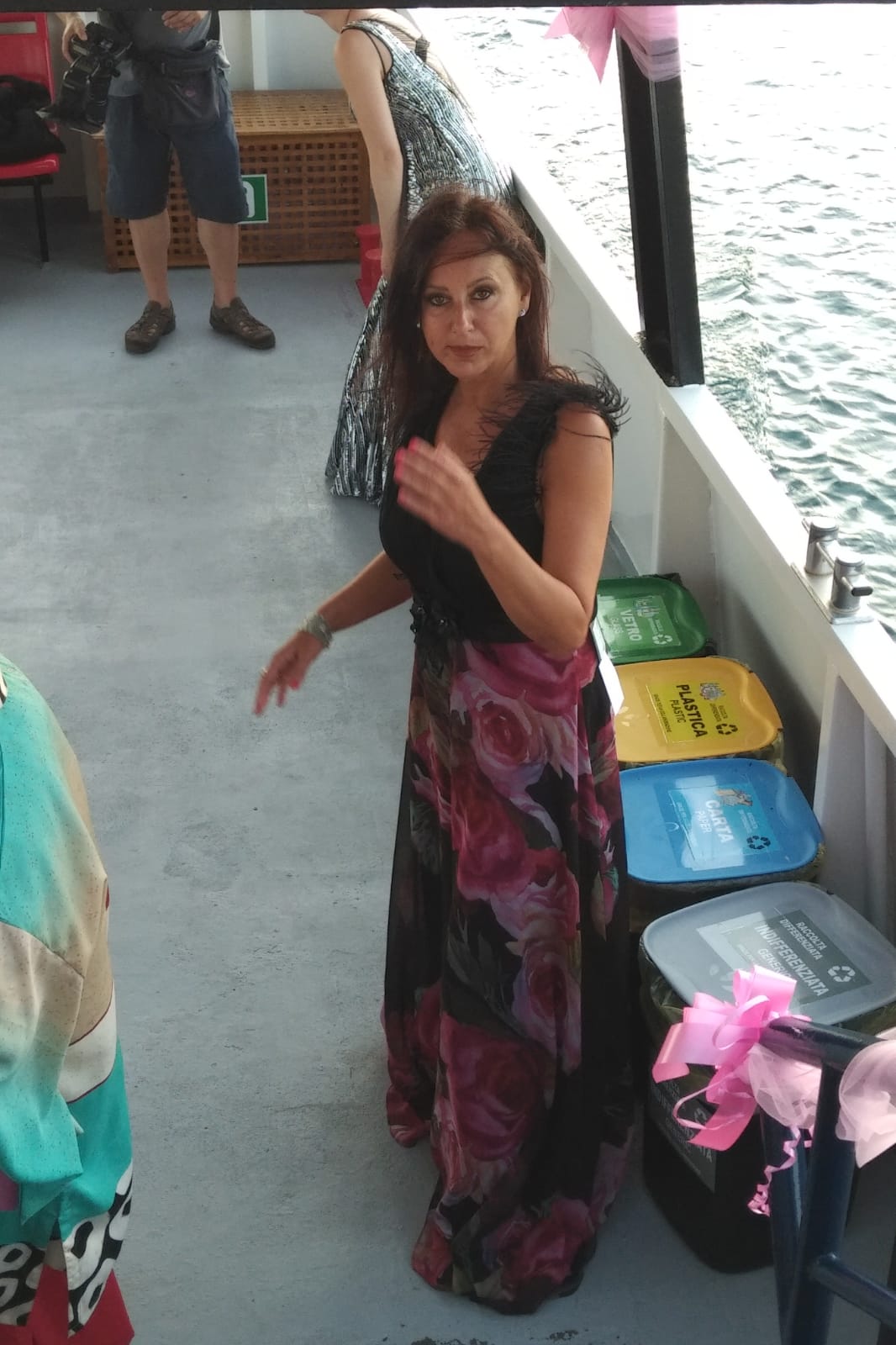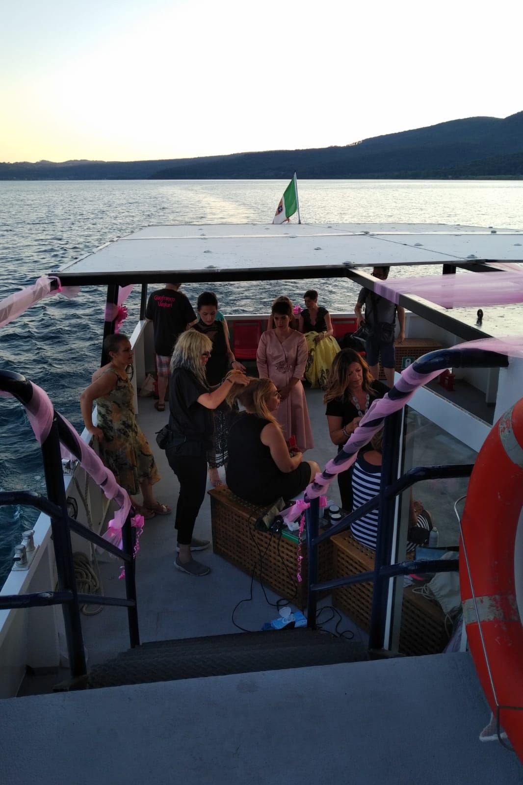E mentre sottocoperta parrucchieri e truccatori insieme allo stilista Gianfranco Venturi le preparano per la sfilata, sul ponte tutti elogiano l’iniziativa con sincere e spesso commosse parole di ammirazione nei loro confronti. Il clima è di allegria e solidarietà, ancor più di comunanza e condivisione, tutti fanno tutto per poter collaborare: chi porta il ghiaccio chi i tramezzini chi l’acqua e chi gli abiti o gli accessori. I produttori locali hanno il pane, e le pizze, il formaggio, i vini per l’aperitivo “Non toccate i vestiti con le mani unte di tramezzini” “Lavatevi le mani in bagno” “Ma insomma state attente” “Vieni qui tesoro la cerniera non è chiusa bene” “Girati cara, ecco, il calpello così va meglio”. Scende la sera. La motonave attracca al molo, gli ospiti scendono, a bordo restano le modelle,lo stilista, i parrucchieri, i truccatori per gli ultimi dettagli. La passeggiata lungolago