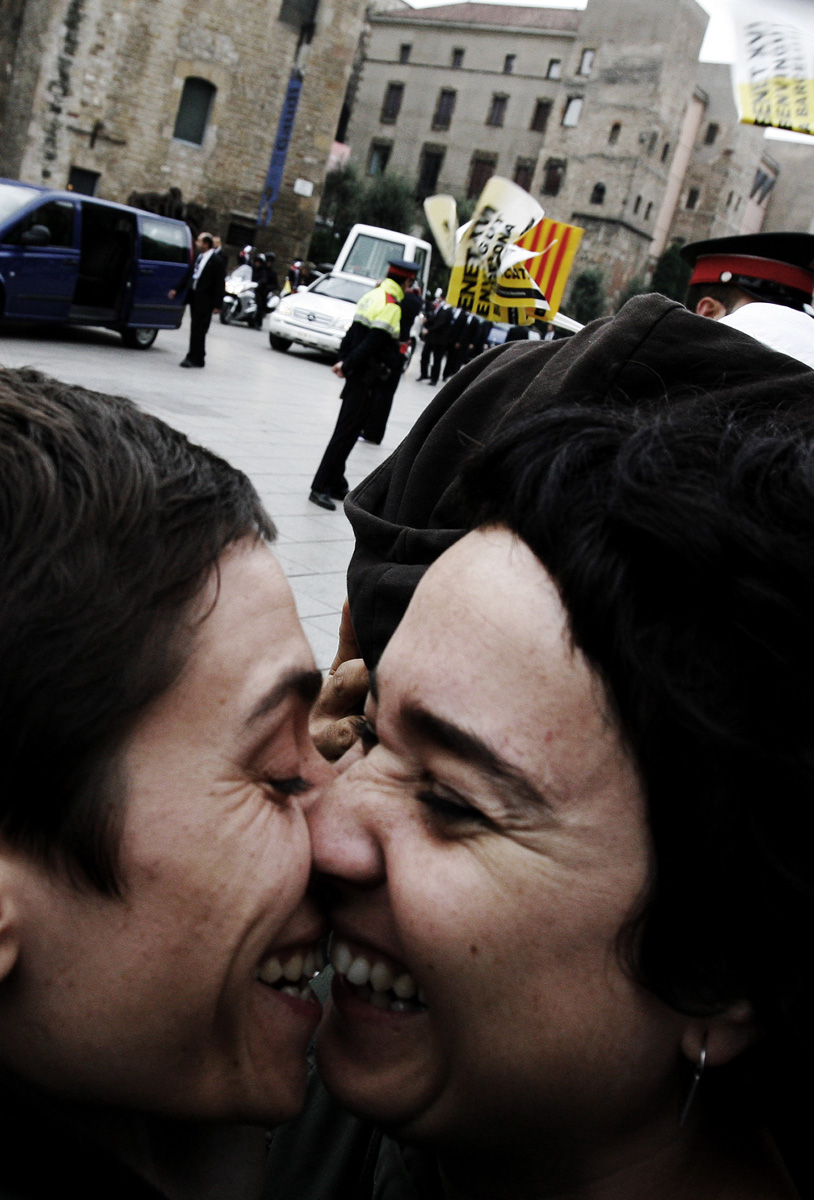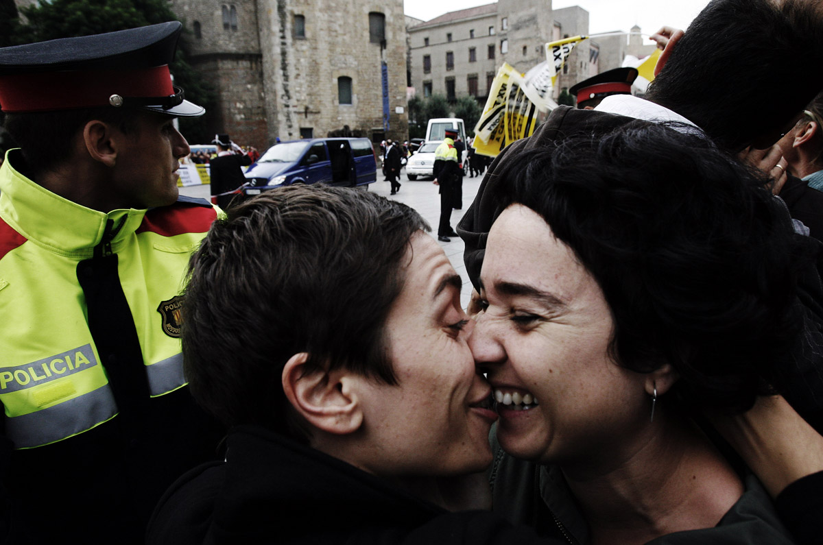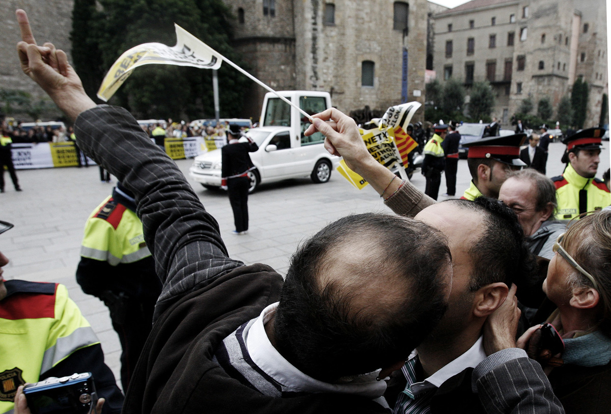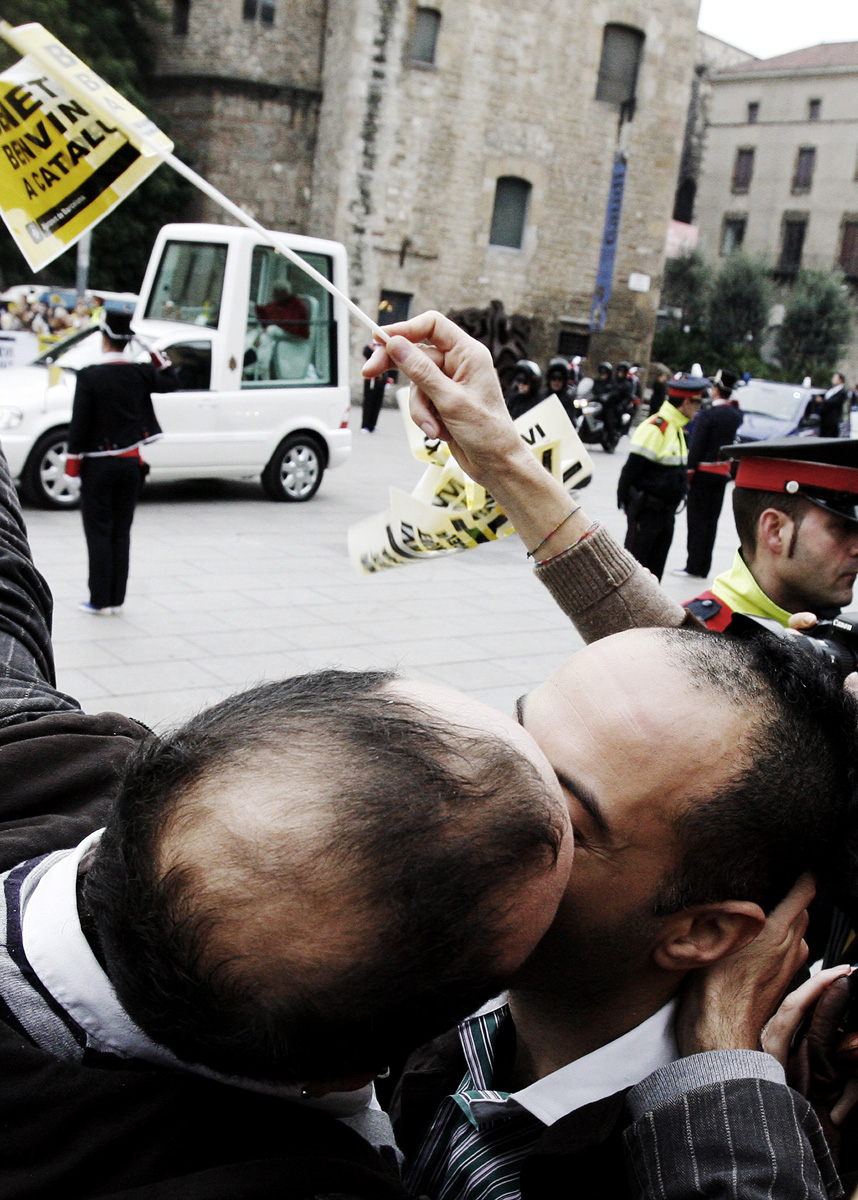 BARCELLONA – Centinaia di coppie gay e lesbiche spagnole si sono date appuntamento nella piazza della cattedrale di barcellona per protestare contro la visita di Benedetto XVI.