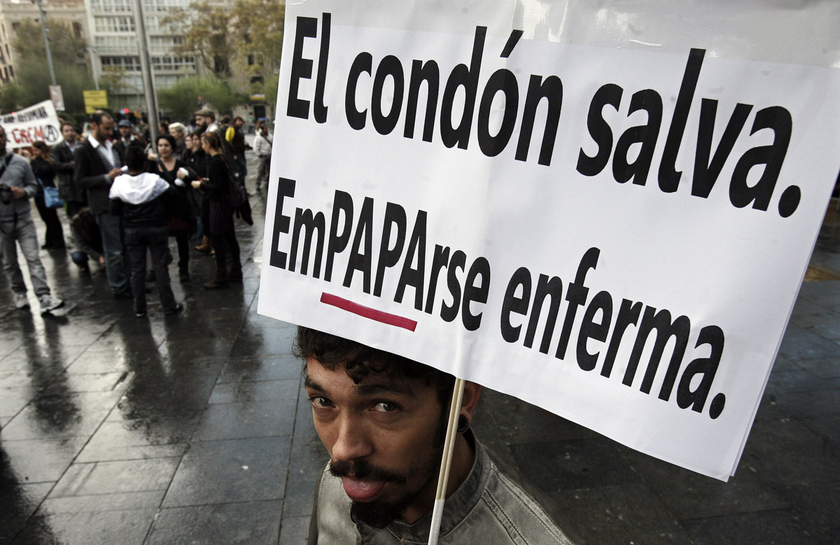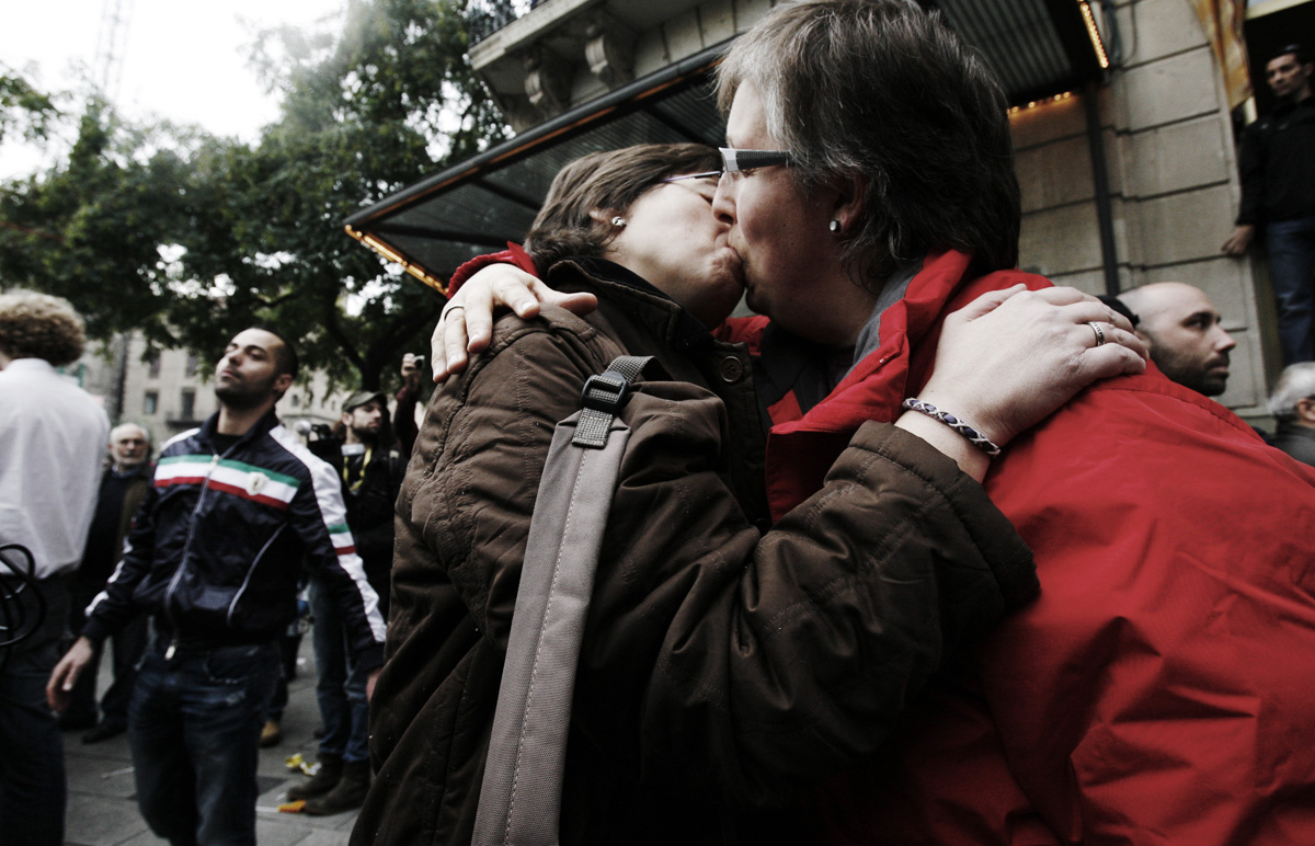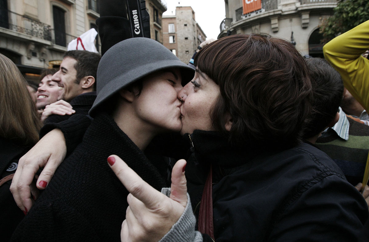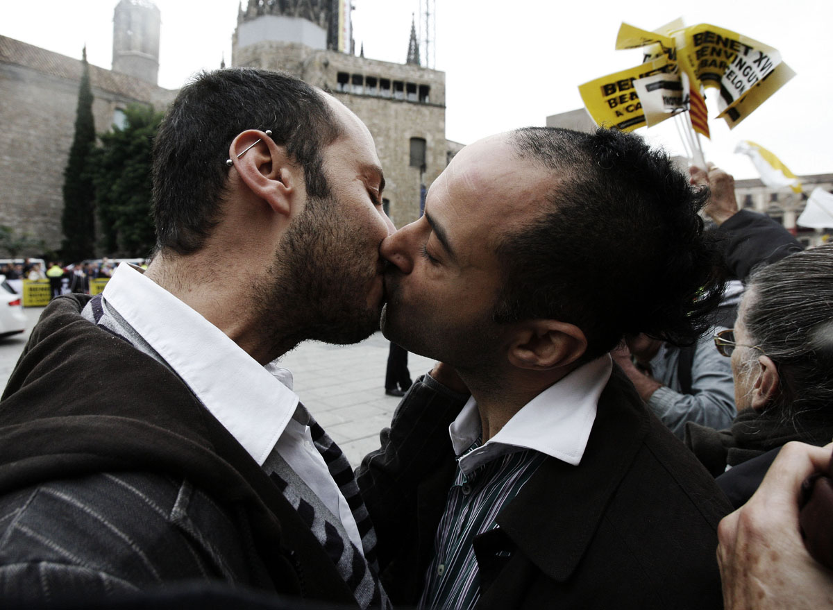 BARCELLONA – Centinaia di coppie gay e lesbiche spagnole si sono date appuntamento nella piazza della cattedrale di barcellona per protestare contro la visita di Benedetto XVI.