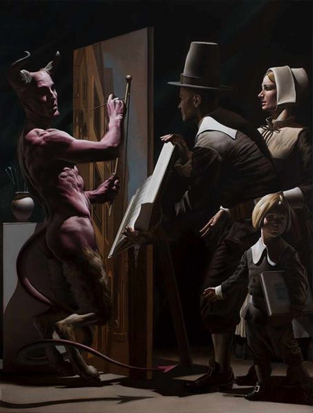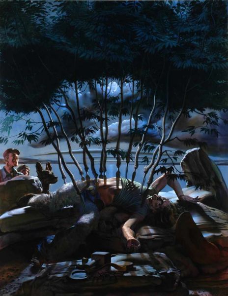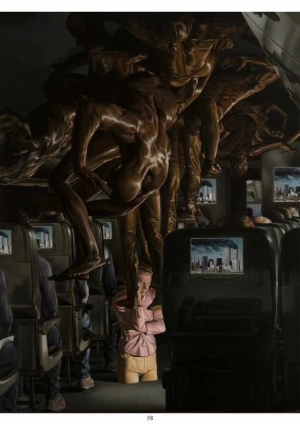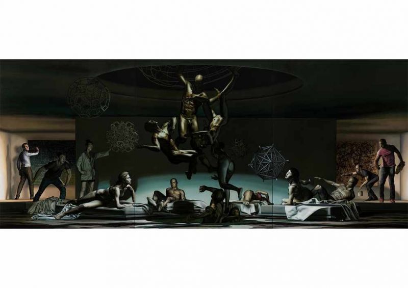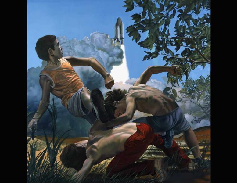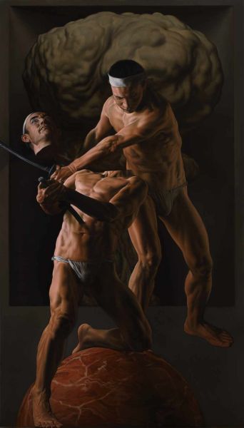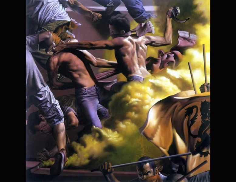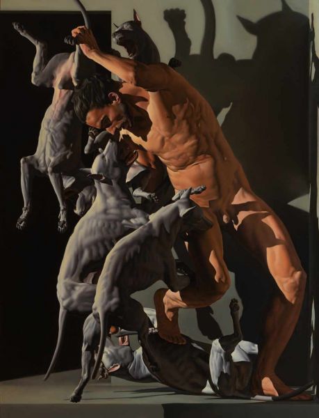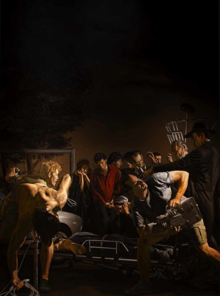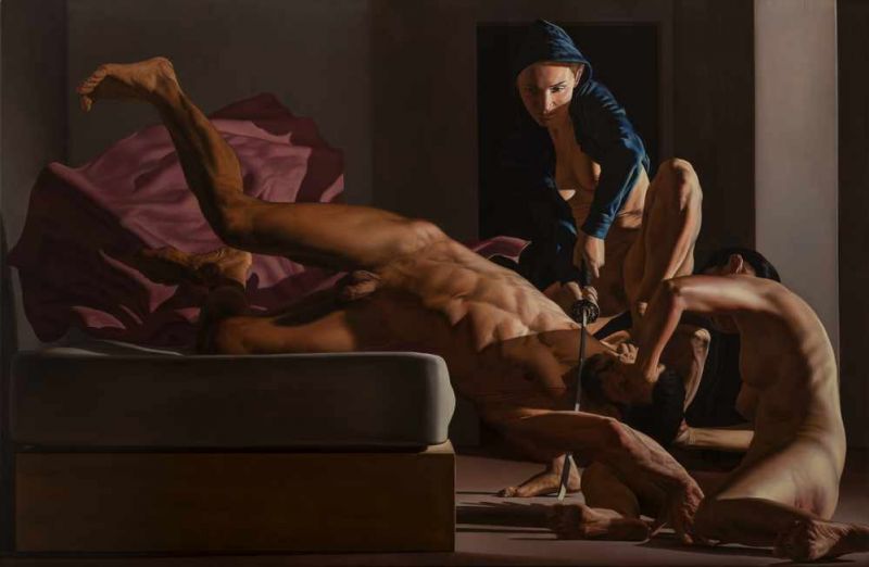 Utilizzo strutture compositive classiche per narrare e rappresentare temi che non sono necessariamente classici. Come accennavo prima non amo la nostalgia e non voglio fare opere nostalgiche. Narrazioni attuali possono, infatti, ambire ad essere formalizzate entro strutture compositive classiche. Vedo il classicismo come lo stile per eccellenza anche per tematiche contemporanee. C’è poi una sorta di esigenza, di volontà di aggredire visivamente lo spettatore, nello stesso modo in cui io lo sono stato dalla bellezza della pittura rinascimentale. In fondo il Giudizio Universale di Michelangelo è tra le opere più eccessive di tutti i tempi. Questo è lo stato emotivo che io cerco di evocare. Non è quindi lo spettatore ad entrare nel quadro, sono le immagini che si proiettano verso di lui, sono i personaggi del dipinto che cercano di penetrare nella nostra realtà, non il contrario. Per questo le figure sono aggettanti, sempre sul limite della superficie pittorica. Anche Caravaggio sembra far emergere dall’oscurità e dall’oblio del tempo le immagini che, attraverso squarci di luce, irrompono nel nostro mondo. Dipingo spesso situazioni che suggeriscono violenza per lo stesso motivo. Ma come si può notare è una violenza non cruenta, non c’è mai sangue, infatti. La violenza è parte del nostro mondo, a me interessa osservarla, poterla considerare, ma in una forma razionalizzata. Cerco di recuperare e restituire il senso di una tragicità classica, dove c’è però una sospensione di giudizio.