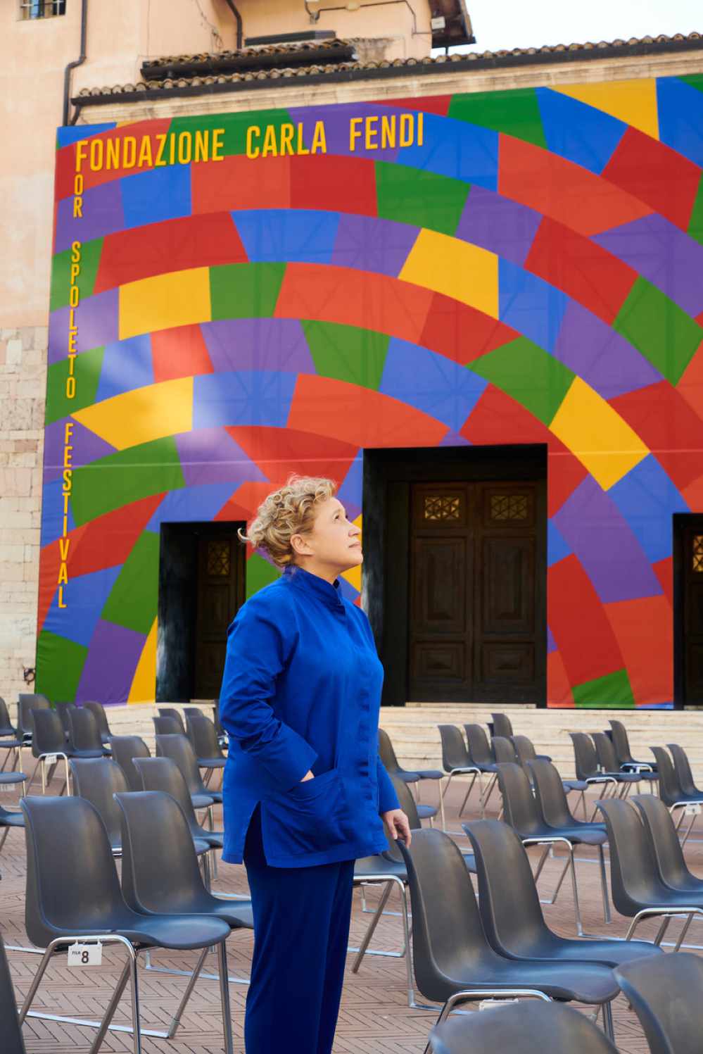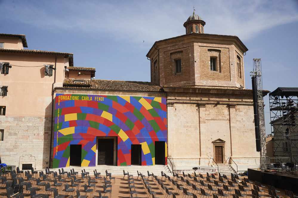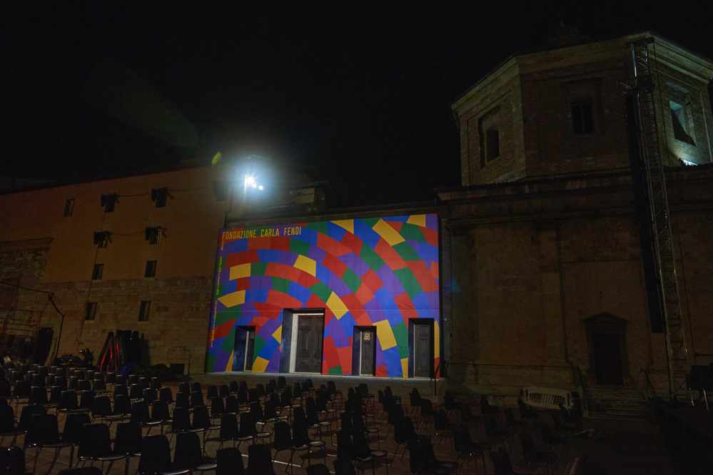 Volevo aggiungere una cosa che mi sta molto a cuore e che mi piace particolarmente di questo progetto. Si tratta del murale che abbiamo realizzato al Teatro Caio Melisso Spazio Carla Fendi, che copre tutta la facciata interagendo con gli altri monumenti. Riproduce un Wall Drawing di Sol LeWitt con dei colori molto accesi. Vorrei che sia di buon augurio per tutti.