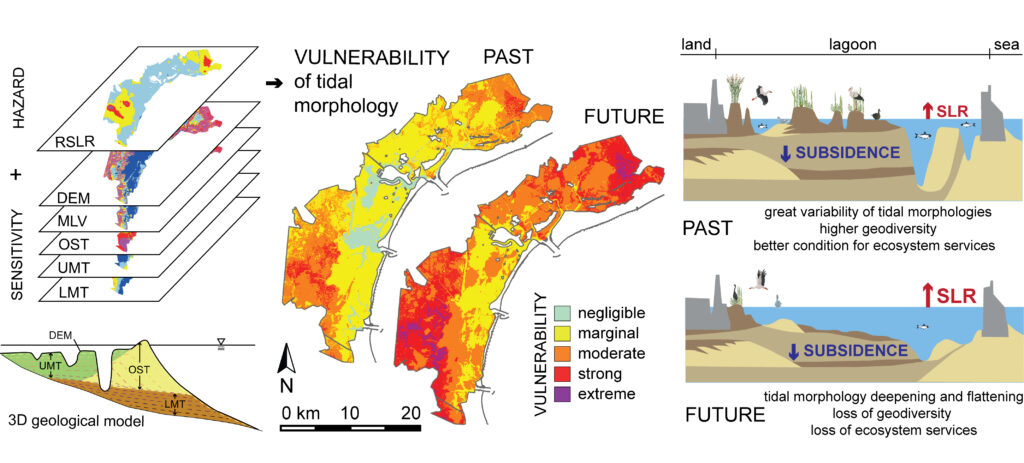 L’innalzamento del livello del mare e il progressivo abbassamento del suolo stanno gravemente minacciando la diversità delle coste basse soggette all’azione delle maree, che hanno reso la laguna di Venezia uno dei paesaggi costieri umidi più peculiari del Mediterraneo per la sua ricchezza di geodiversità. Secondo una ricerca condotta dall’Istituto di geoscienze e georisorse del Consiglio nazionale delle ricerche di Padova (Cnr-Igg), entro il 2050 l’80% delle morfologie lagunari sarà classificato da moderatamente a estremamente vulnerabile, con un raddoppio delle aree colpite rispetto agli anni Novanta.