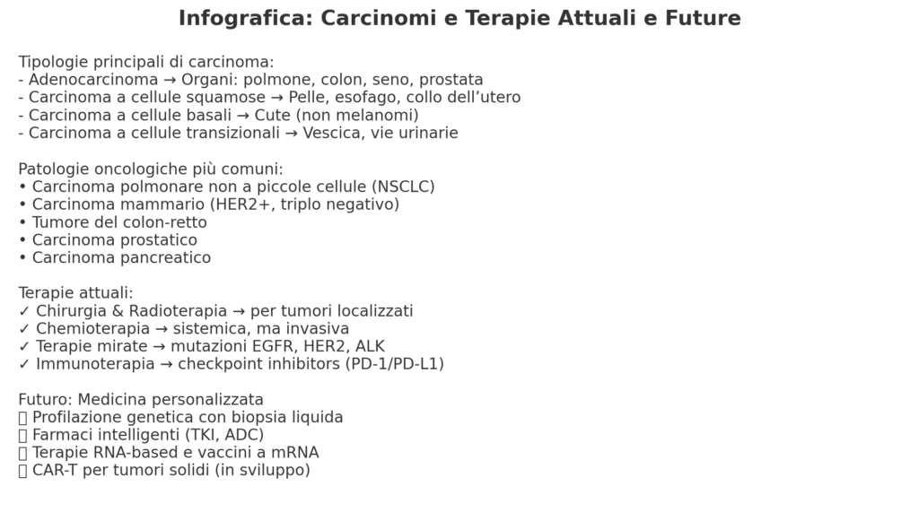 Farmaci intelligenti, come gli inibitori delle tirosin-chinasi (TKI) o gli anticorpi monoclonali coniugati, colpiscono selettivamente le cellule tumorali risparmiando i tessuti sani. Queste soluzioni sono sempre più centrali nelle cure di:
